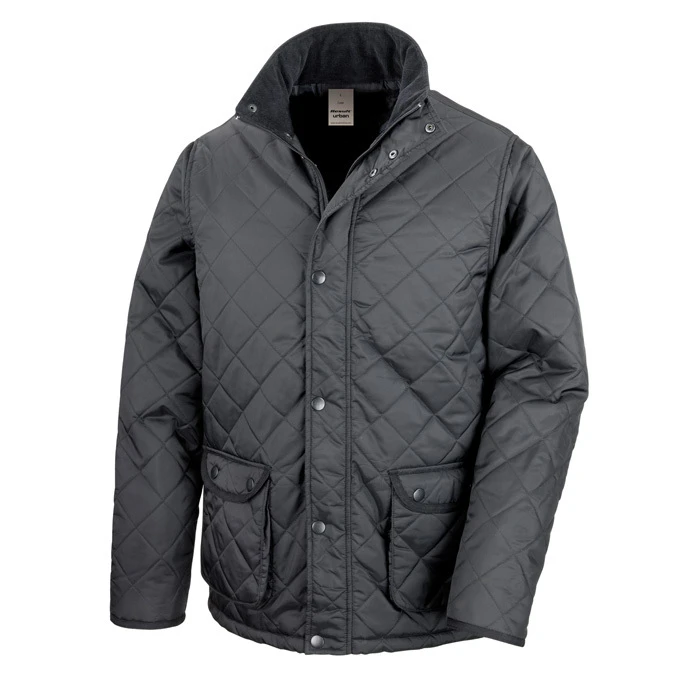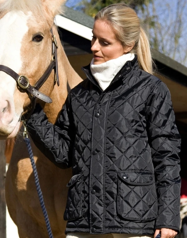 outer: 2x2 Diamond Quilted 210T 100% polyester Taffeta with A/C coating • inner: 100% Polyester 4 oz Polyester wadding • lining: 190T Polyester Taffeta • water repellent • lightweight • stylish Cut • corduroy collar • stud closing front storm flap • full length zip closing • two patch side pockets • jetted side vents • suitability: Leisure and Equestrian