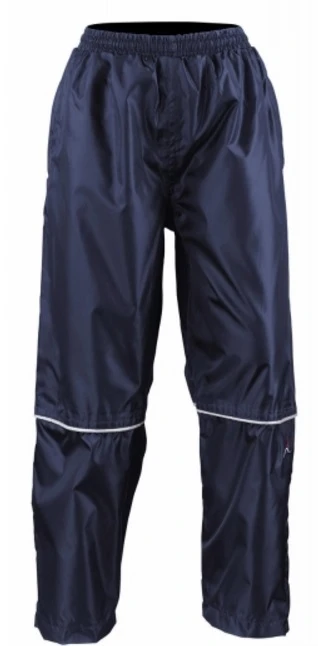 Outer fabric: 210T ripstop polyester with PU coating • lining: nylon • wind- and watertight (taped seams) • elastic hem with drawcord • patch hip pocket with zip • zipped side vents • reflecting piping in the calf area • leg end with zip. Suitable for transfer print.