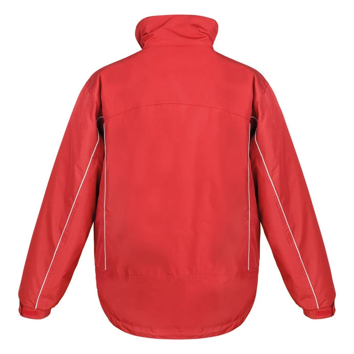 Outer: 100 % ripstop polyester with PVC coating • padding: 160 gsm • 100 % polyester taffeta • waterproof (taped seams) • 2-way zip • chest pocket • two side pockets with zip • decorative reflective piping to body and arms • various inside pockets incl. mobile phone pocket with tear release fastening • elastic cuffs with tear release fastening • elastic drawcord with stoppers • slightly longer back • concealed embroidery and print access.