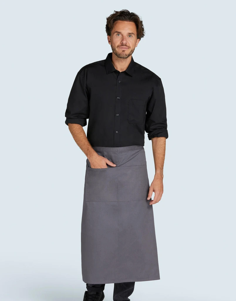 This Top-Seller medium length bistro apron is now available with a large 2 compartments front pocket. Its poly-cotton fabric is easy-care and washable at 60° whatever the colour. Get it decorated for enhanced visibility of your Business.