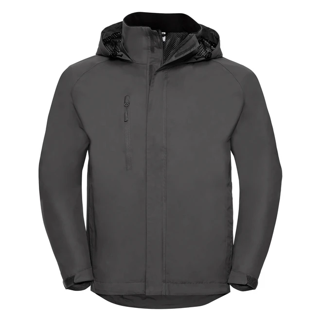 Weight: 190gsm; Material: Outer: 100% Nylon (taslan) with PU coating; Inner: mesh lining; Critically taped seams, waterproof (2,000 mm), Breathable (2,000 g/m² in 24h), 3 piece hood in collar, Reverse tone-in-tone YKK zip with chin protection, Concealed wind protection border with hook-and-loop fastener, Various zipped pockets, Adjustable sleeve ends with hook-and-loop fastener, Slightly longer back piece, Hem with elastic drawcord and stoppers, Access for decoration on hem. Certificates: STANDARD 100 by OEKO-TEX®; WRAP