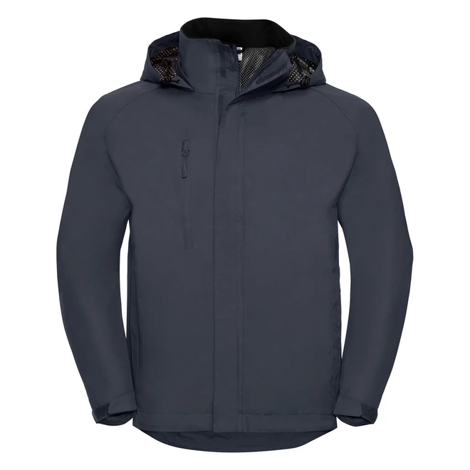 Weight: 190gsm; Material: Outer: 100% Nylon (taslan) with PU coating; Inner: mesh lining; Critically taped seams, waterproof (2,000 mm), Breathable (2,000 g/m² in 24h), 3 piece hood in collar, Reverse tone-in-tone YKK zip with chin protection, Concealed wind protection border with hook-and-loop fastener, Various zipped pockets, Adjustable sleeve ends with hook-and-loop fastener, Slightly longer back piece, Hem with elastic drawcord and stoppers, Access for decoration on hem. Certificates: STANDARD 100 by OEKO-TEX®; WRAP