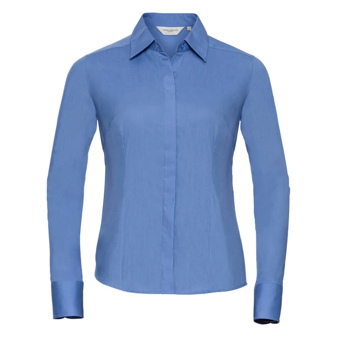 Weight:105gsm (White: 110gsm); Material: 65% Polyester, 35% Cotton (poplin); Ladies’ Long Sleeve Fitted Polycotton Poplin Shirt; Long sleeve, Concealed placket, Stylish yoke design, Modern rounded 2 button cuffs, Fitted style with shaping at waist, bust, front and back hem darts, Decorative top stitch on darts, Rounded hem, Spare buttons, Easy Care; Certificates: STANDARD 100 by OEKO-TEX®; WRAP