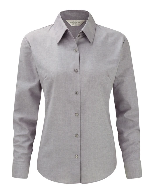 Weight: 135 g/m² (White: 130 g/m²); Material: 70% Cotton, 30% Polyester (Oxford); Ladies’ Long Sleeve Tailored Oxford Shirt; Long sleeve, 2 button collar stand with classic shaped collar, Rounded 2 button adjustable cuffs, Darts at bustline and back for tailored fit, Rounded hem, Spare buttons, Easy Care. Certificates: STANDARD 100 by OEKO-TEX®; WRAP