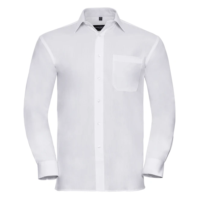 Weight: 125gsm (White: 120gsm); Material: 100% Cotton (poplin); Men’s Long Sleeve Cotton Poplin Shirt; Long sleeves, Classic style boned collar, Tonal buttons, Back yoke with 2 side pleats, Pocket over left chest mitred edge pocket, Rounded 2 button adjustable cuff plus single button on cuf, Straight bottom hem, Spare buttons, Easy Care; Certificates: STANDARD 100 by OEKO-TEX®; WRAP