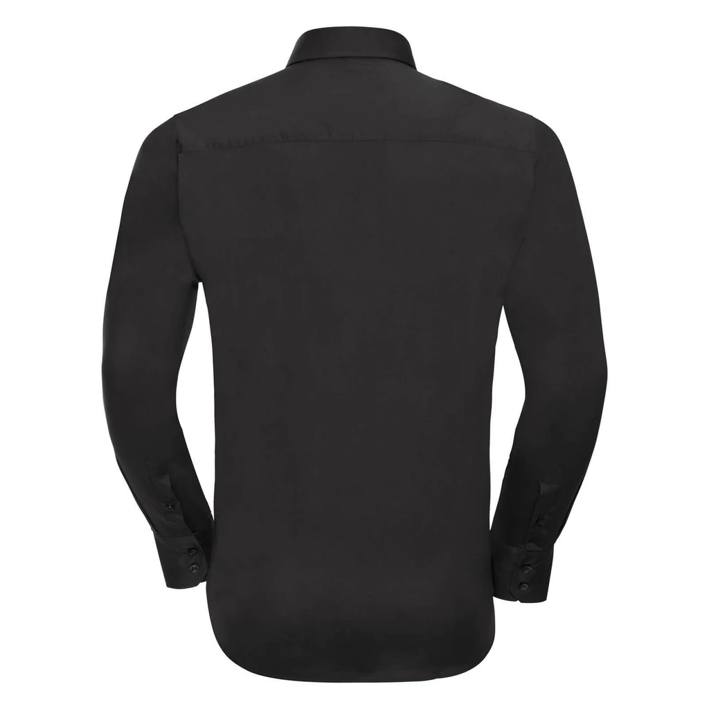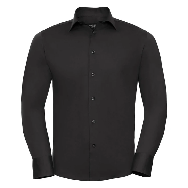 Weight: 140 gsm; Material: 97% Cotton 3% Elastane Poplin; Tailored Longsleeve Stretch Shirt; Smooth fabric with a slight stretch for added comfort and fit, Smart, semi cut-away collar with single button, Tonal buttons, Shoulder yoke, Mitred double buttoned cuff with single button on cuff gauntlet, Fitted style, Rounded hem, Spare buttons, Easy Care; Certificates: STANDARD 100 by OEKO-TEX®; WRAP