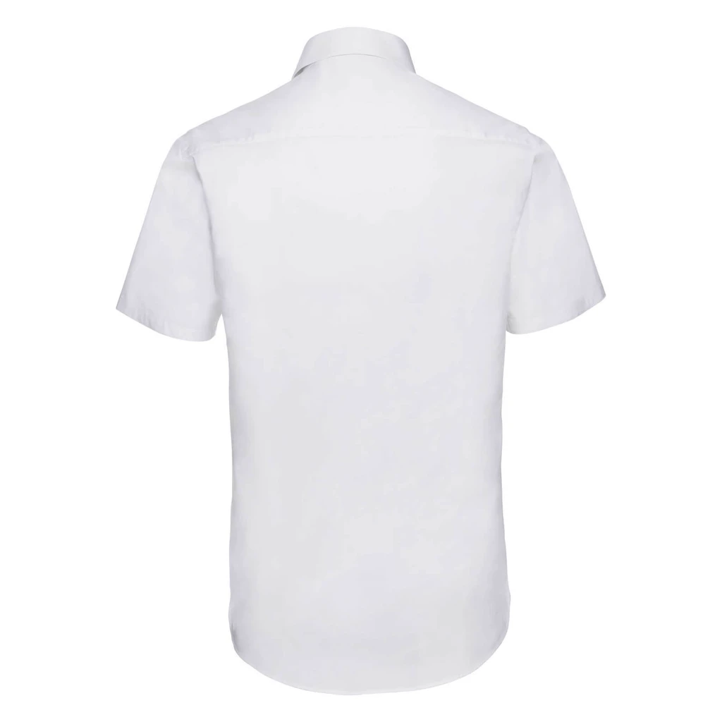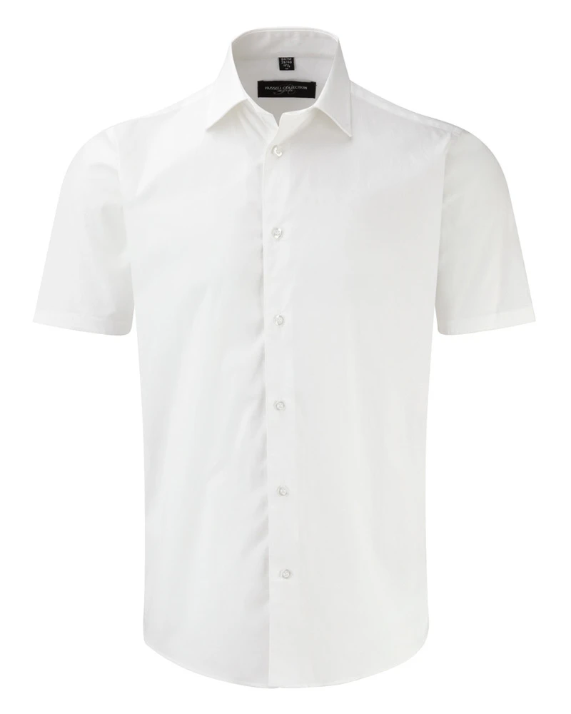 Weight: 140gsm; Material: 97% Cotton, 3% Elastane Poplin; Tailored Shortsleeve Shirt; Smooth fabric with a slight stretch for added comfort and fit, Smart, semi cut-away collar with single button, Tonal buttons, Shoulder yoke, Fitted style, Rounded hem, Spare buttons, Easy Care; Certificates: STANDARD 100 by OEKO-TEX®; WRAP