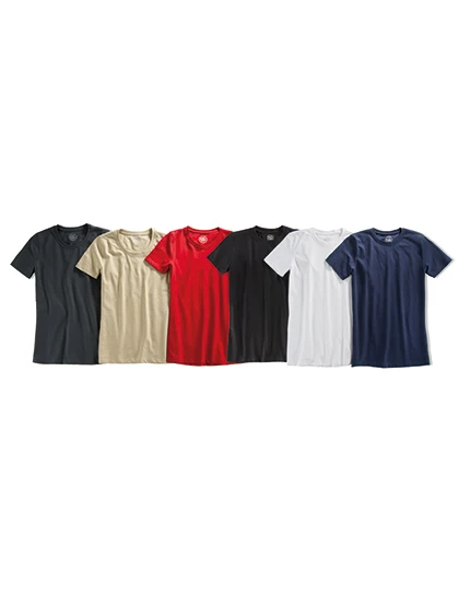 Short-sleeved T-shirt with rounded neckline. Cotton washed with enzymes means the upper surface is pleasantly smooth and soft. The T-shirt is pre-washed at high temperatures; therefore it is particularly stable in shape and colourfast. A very hard-wearing and easy care, non-iron quality.
