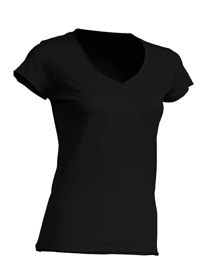Ladies V-neck T-shirt. Unfinished sleeves and bottom.