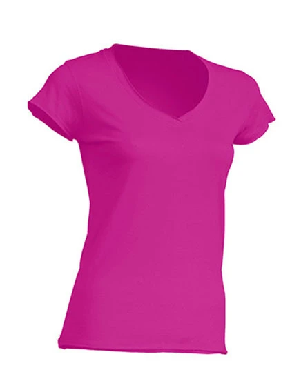 Ladies V-neck T-shirt. Unfinished sleeves and bottom.