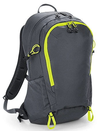 TearAway label for ease of rebranding, ultra lightweight yet durable, hydration bladder compatible, trekking pole attachment points, water resistant fabric, detachable waterproof rain cover, zippered front pocket, internal slip pocket, zippered internal valuables pocket, key hook, elasticated mesh side pockets, low-profile ventilated back panel, padded adjustable shoulder straps, adjustable waist and chest straps, reflective accents, grab handle; Dimensions: 30 x 50 x 21 cm; Capacity: 25 litres
