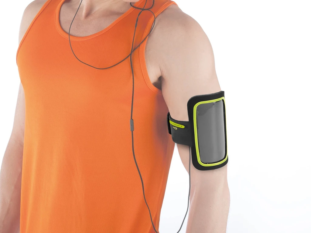 Smartphone neoprene arm-holder for all sports / outdoor activities, with touch screen function window and coloured contour. Suitable for iPhone 4,5,6 and Samsung Galaxy S 2,3,4,5. iPhone is a trademark of Apple Inc. Samsung Galaxy is a trademark of Samsung Ltd.