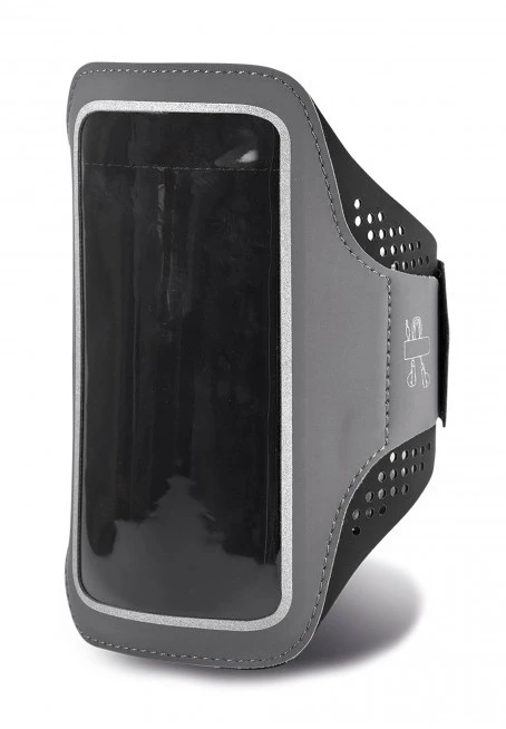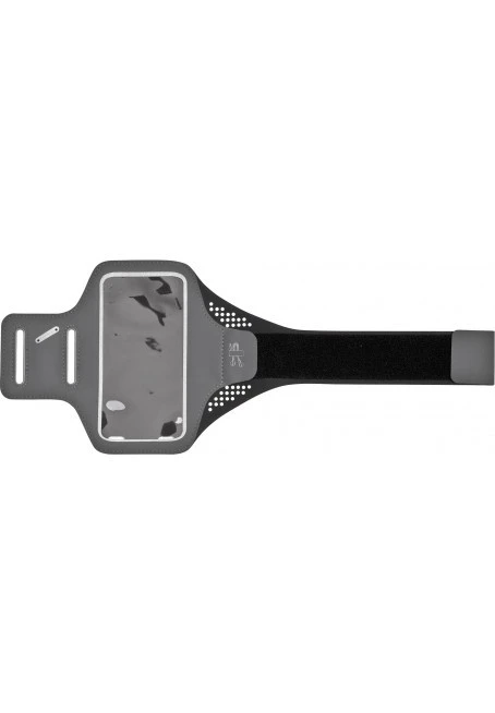 Lycra® armband for smartphone up to 5.5" with window to allow use of touchscreen. Keyholder and loop for storing / blocking headphone wire. Water repellent fabric. Dimensions: 10 x 17 cm.