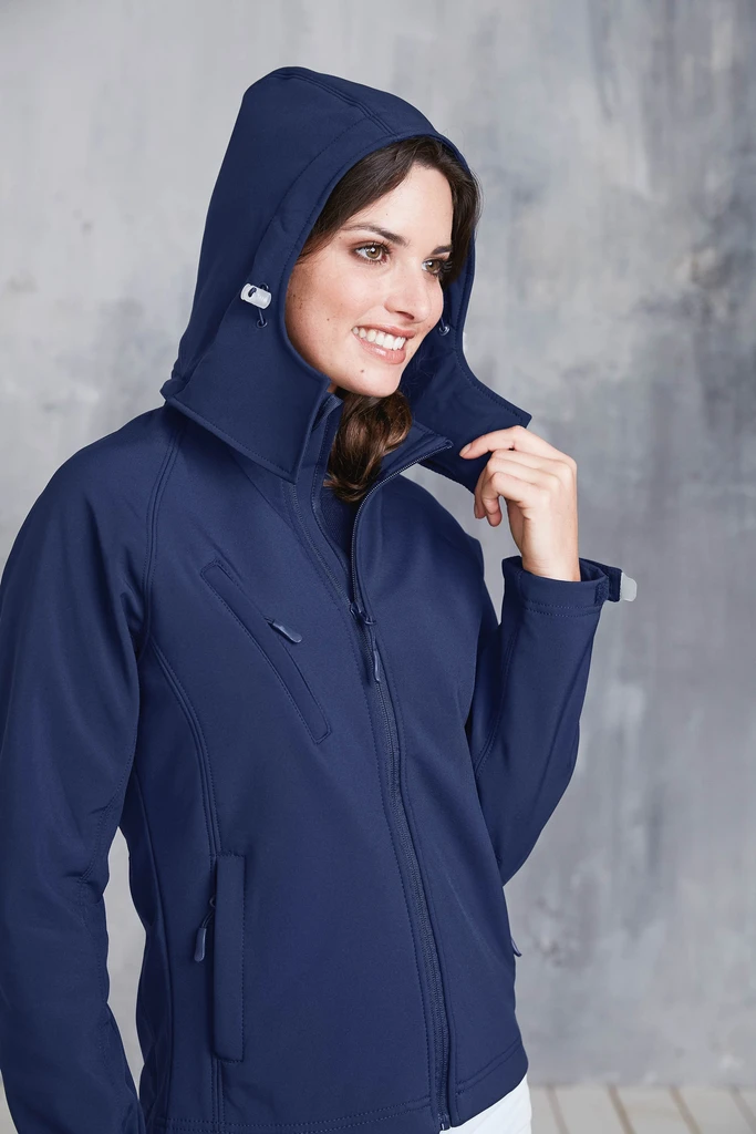 to 1000 g/m2/24h and water resistant up to 5000 mm. 94% polyester 6% elastane outer layer. Performance membrane mid layer. Anti pill micro fleece inner layer. Raglan sleeves. Zip through front. 2 front zipped pockets. 1 zipped chest pocket on right side. Detachable hood with drawcord and grip strip. Adjustable cuffs with grip strip. Invisible zip access at inner chest for decoration.
