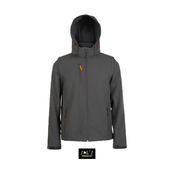 SOFT SHELL 340 - UNISEX - 3 layers, outside: 94% polyester - 6% elastane, inside: microfleece 100% polyester, TPU Membrane - 8000 mm waterproof and breathable membrane; Zip fastening, 3 zip pockets, removable sleeves and peaked hood, drawcord at hood and bottom