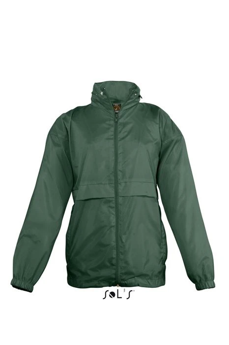 QUALITY: 100% 210T polyamide, waterproof, ventilation eyelets, secured inner drawstring at bottom; Opening with zip - hood folded into the collar, 2 outside zipped pockets, "in bag" folding system elasticated ties at waist