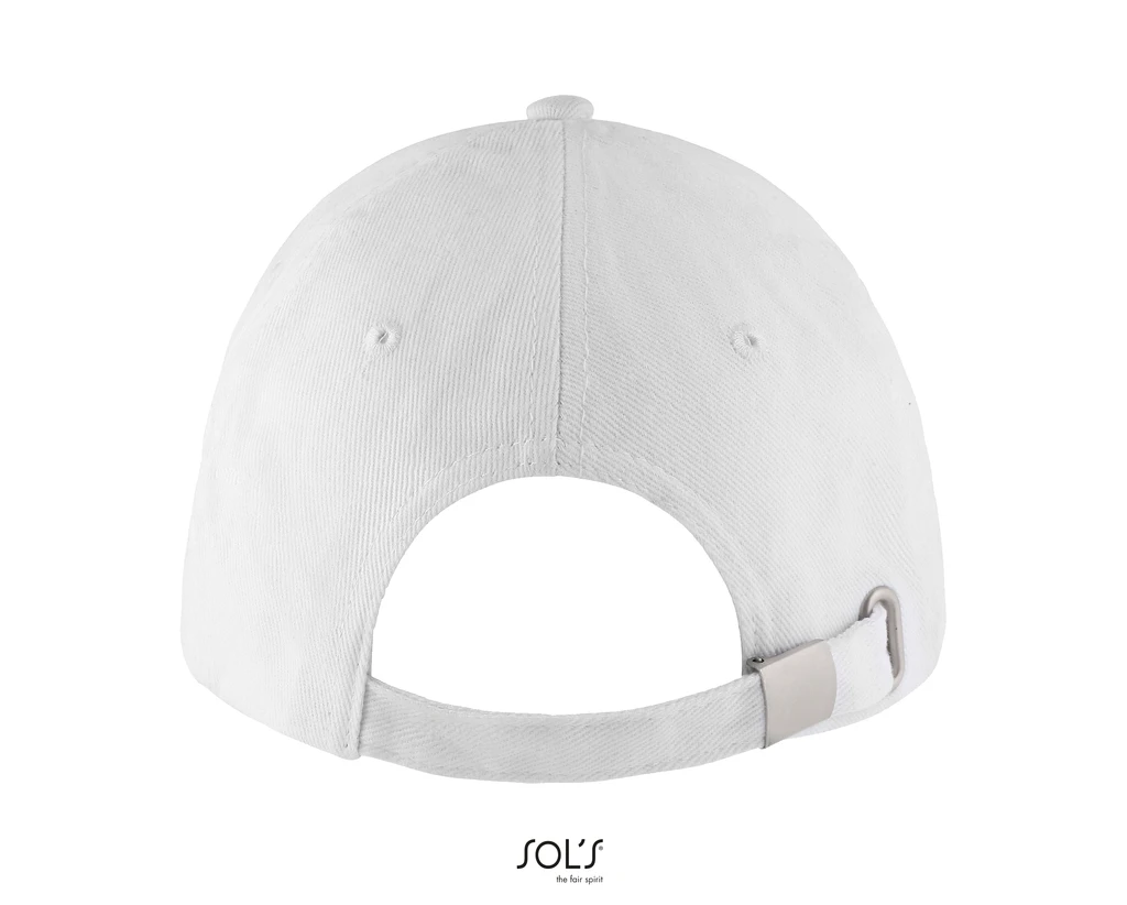 QUALITY: TWILL 260 - 100% thick brushed cotton; Preformed peak, 6 embroidered ventilation eyelets, adjustable back fastening with metal buckle