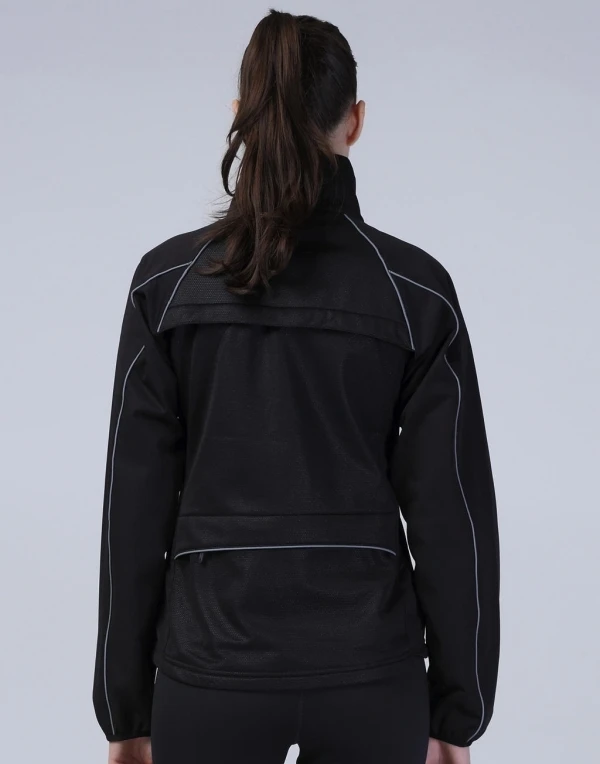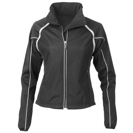 100 % HydraDri polyester • water and windproof • breathable • full zip with chin protection • one removable arm-shoulder-back piece turns jacket into vest • reflective piping • zipped side pockets • elastic cuffs • zip pockets on back • slightly longer rounded back • elastic hem with anti-skid elastic on inside • feminine • fitted waist • suitable for embroidery and print