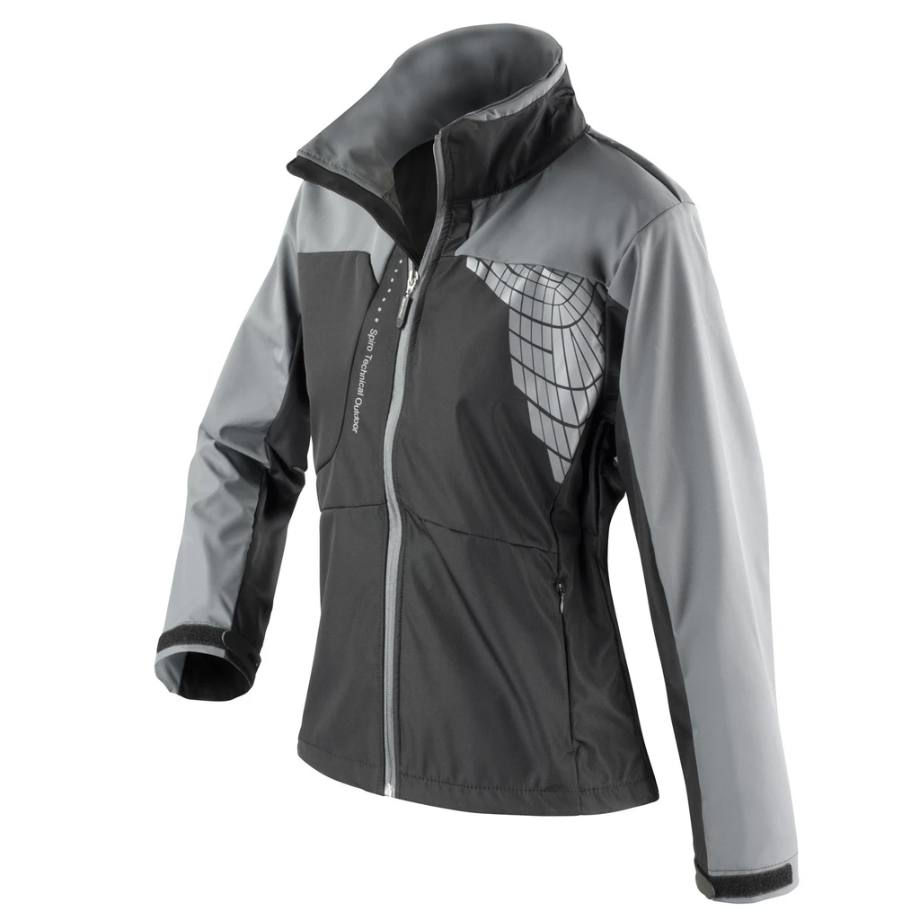 Outer shell: 100 % polyester • lining: 100 % polyester • 190 gsm single jersey and mesh lining • water- and wind proof • breathable • three-layered soft shell fabric • fast drying • stand-up collar with drawstring • full zip • MP3 player pocket with opening for head phones on the right side • underarm ventilation zip • adjustable tear release cuffs • zip on side pockets • slightly extended curved back with Spiro logo • hem with drawstring and stoppers • suitable for embroidery and printing