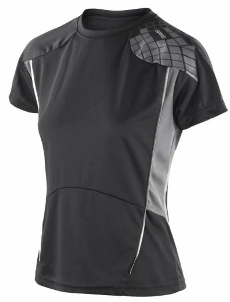145 gsm • 100% honeycomb polyester • breathable function shirt • neck tape in contrast colour • Spiro logo pattern on left shoulder • side contrast gussets with reflective stripes • various decorative seams • mesh lining on back for additional ventilation • double-needle stitching on sleeve and bottom hem • side seams • suitable for embroidery and printing
