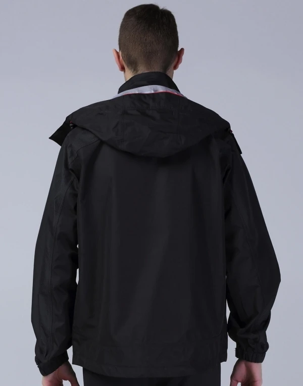 100 % polyester • outer fabric: 230 gsm (shoulders: 260 gsm) HydraDri polyester • 3-layer waterproof (8.000 mm) and breathable coating • lining: polyester mesh • 2-layer waterproof removable hood with drawcord • red accents and wind protection border inside • three zipped pockets • reflecting stripes • adjustable elastic sleeve ends with hook-and-loop fastener • drawcord with stoppers on bottom hem. Suitable for embroidery and print (access for decoration on left chest).