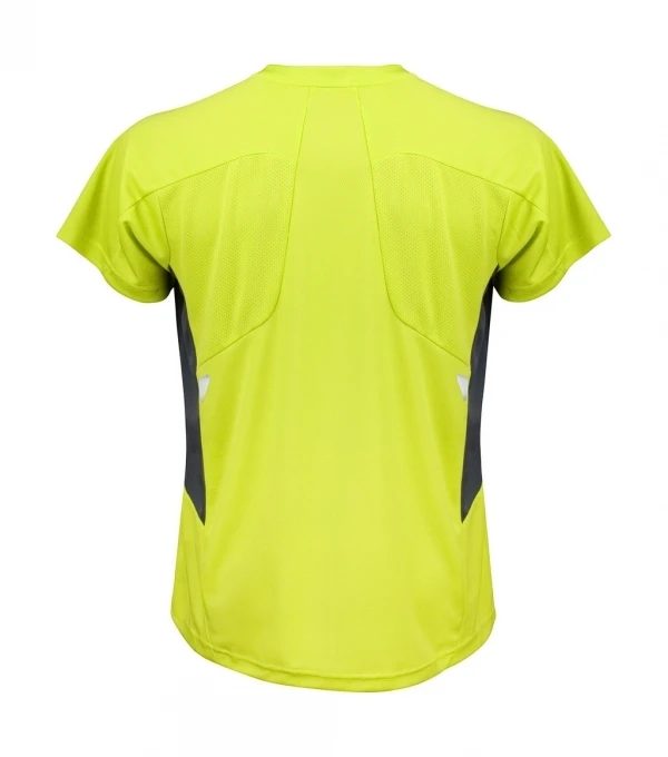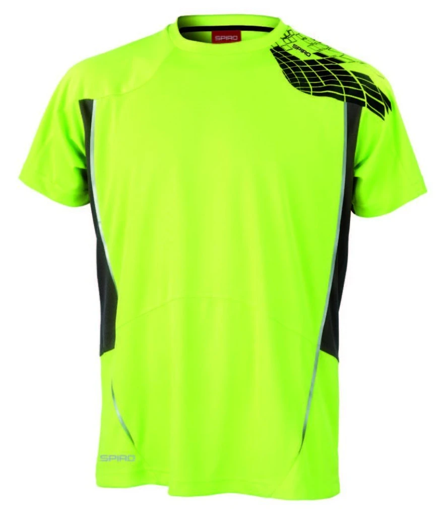 145 gsm • 100% honeycomb polyester • breathable function shirt • neck tape in contrast colour • Spiro logo pattern on left shoulder • side contrast gussets with reflective stripes • various decorative seams • mesh lining on back for additional ventilation • double-needle stitching on sleeve and bottom hem • side seams • suitable for embroidery and printing