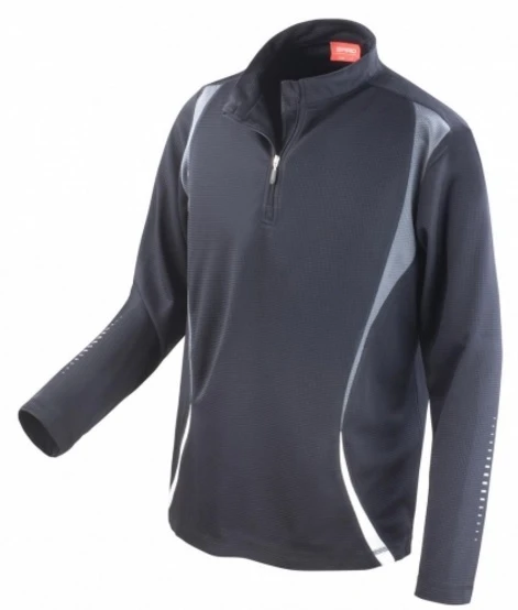 185 gsm • 100% polyester • long sleeve function shirt • stand-up collar • 1/4 zip with chin protection • colour contrast gussets up front and on back • stripe pattern on lower sleeve • decorative stitching on sleeve and bottom hem • side seams • suitable for embroidery and printing