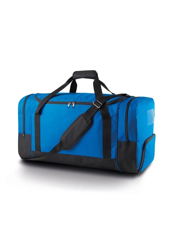 Sports/games bag in polyester 600D PVC backing. 2 side pockets and a shoe storage compartment, removable padded shoulder strap. Transparent label holder for easy identification. Large size model: 85 liters. SBS zips.