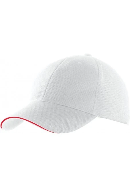 100% polyester Pique. 6 panels. Ventilation eyelets. Contrast sandwich. Terry inner sweatband for better comfort. Size adjuster with tear release fastening.