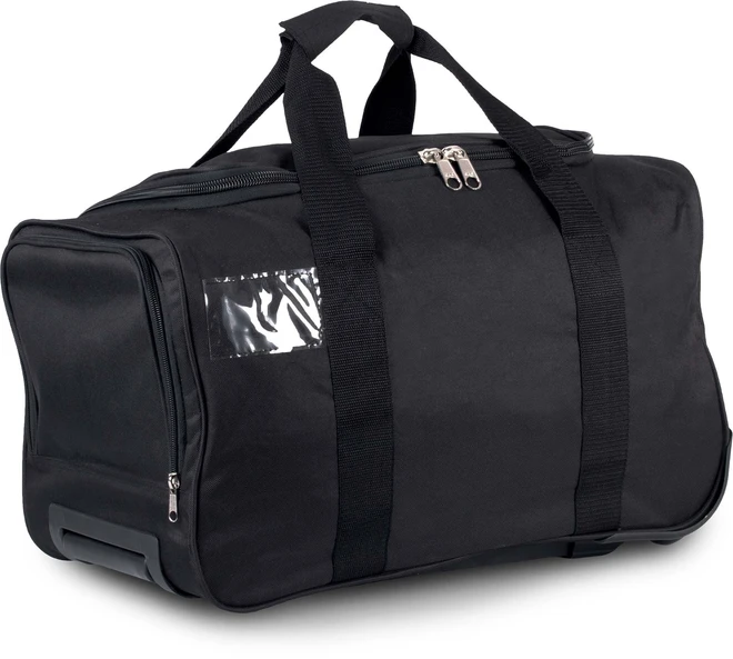 Sports/teams sports bag with trolley system. Medium-sized (55 cm), in 600D polyester. 1 zipped side pocket to hold a pair of shoes, large opening with zip at the top, label holder for identification, reinforced handles with 5 cm straps all around the bag.