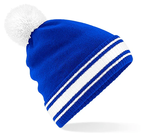 TearAway label for ease of rebranding, cuffed design for optimal decoration, contrasting pom pom and striped cuff, double layer knit, classic colour combinations