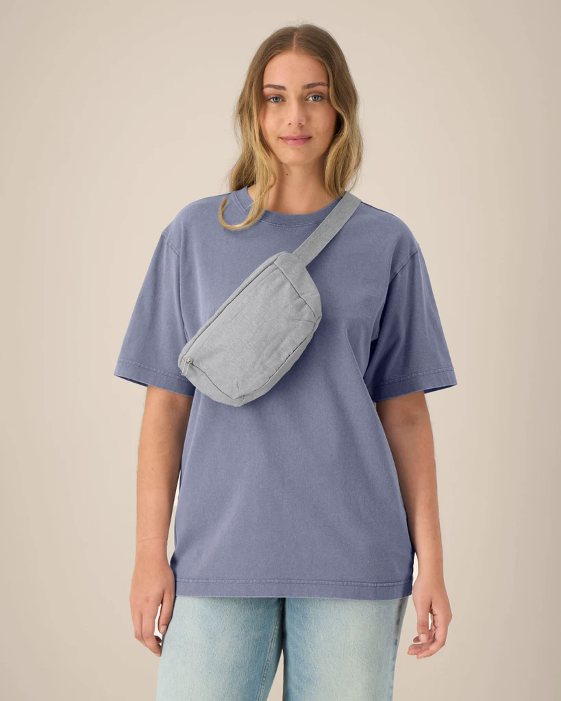 Material: Canvas , 80% Recycled cotton , 20% Recycled polyester; Adjustable grosgrain strap to wear over the shoulder or around the waist, plastic side release buckle, plastic adjuster, elastic stopper, shaping dart at front, nylon coil reversed zipfront pocket; Certificates: Global Recycled Standard (GRS), Fair wear, STANDARD 100 by OEKO-TEX®, Peta - Approved VEGAN