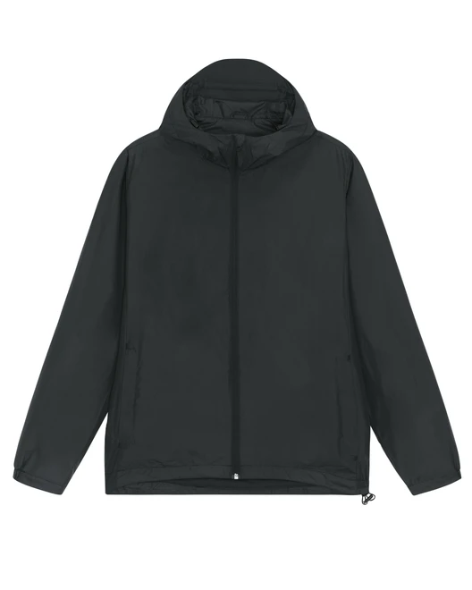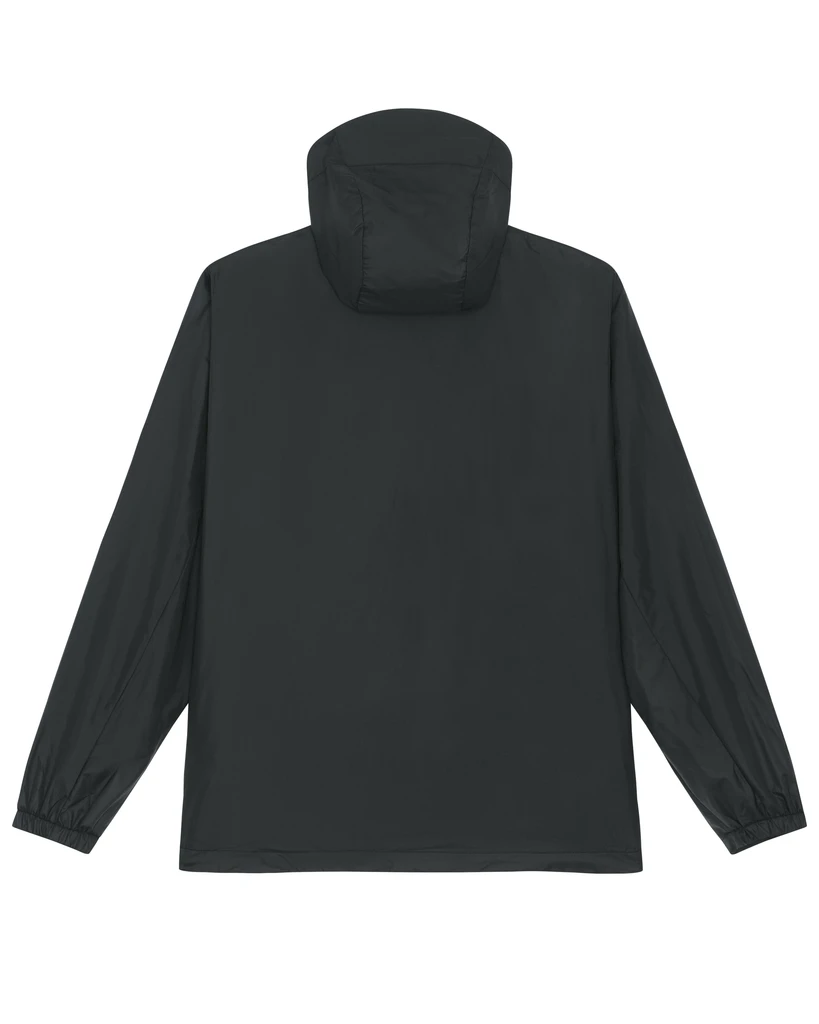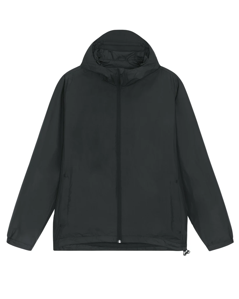Material: 100% Recycled polyester, Fluorine-free DWR; Weight: 75gsm; Medium Fit, set-in sleeve, longer back length with curved hem for protection. bottom hem with adjustable plastic stopper and elastic cord, sealed hood visor and sealed welt pockets, double layered hood with adjustable plastic stopper and elastic cord on inside, reverse nylon zip at center front with chin guard, zipped welt pockets with extra grosgrain puller, side panels for better shape, semi-elastic sleeve cuff, self fabric half moon at back neck, inside zip opening at bottom hem and wearer's left chest for easy decoration; Certificates: Global Recycled Standard (GRS), Fair Wair, STANDARD 100 by OEKO-TEX®, Peta - Approved VEGAN