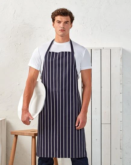 A popular choice for chefs, this full bib apron has 'Butcher's' style stripes down the length of the apron and across the neckband and ties. A traditional favourite amongst catering professionals, this apron is available in Navy, Black and Grey with White striped detail. A width of 72cm with a total length of 101cm.