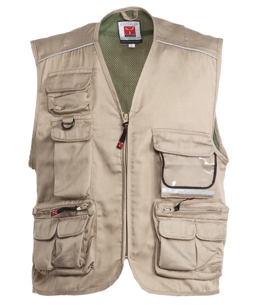 Summer vest, zip fastening, multi-front pocket system with reversible badge holder, reflex piping on the shoulders and back, roomy back hunting pocket. Contrasting colour dry-tech lining, open for easier printing and embroidery