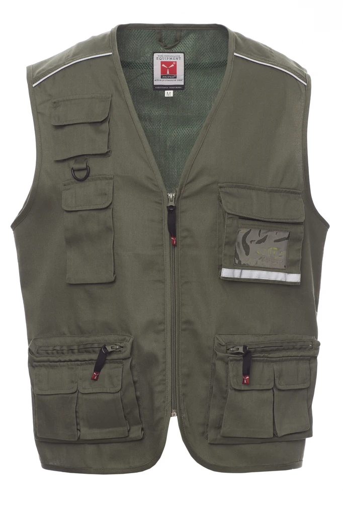 Summer vest, zip fastening, multi-front pocket system with reversible badge holder, reflex piping on the shoulders and back, roomy back hunting pocket. Contrasting colour dry-tech lining, open for easier printing and embroidery