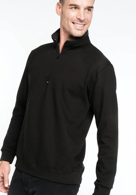 80 % cotton / 20 % polyester. Brushed fleece. Set-in sleeves. Tubular cut. Zipped and taped neck. Matching ribbed cuffs and hem.