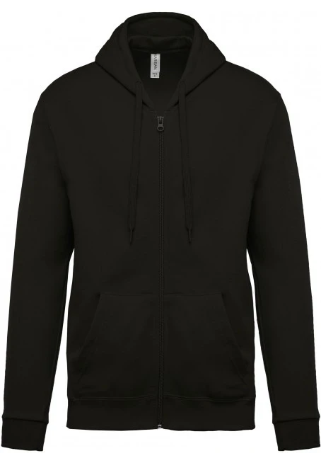 80 % cotton / 20 % polyester. Brushed fleece. Set-in sleeves. Tubular cut. Nylon zip fastening. Lined hood with matching drawstring. Kangaroo pockets. Ribbed cuffs and hem.