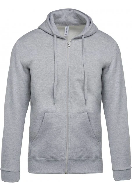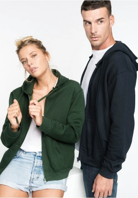 80 % cotton / 20 % polyester. Brushed fleece. Set-in sleeves. Tubular cut. Nylon zip fastening. Lined hood with matching drawstring. Kangaroo pockets. Ribbed cuffs and hem.
