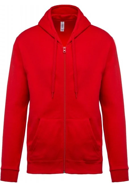 80 % cotton / 20 % polyester. Brushed fleece. Set-in sleeves. Tubular cut. Nylon zip fastening. Lined hood with matching drawstring. Kangaroo pockets. Ribbed cuffs and hem.