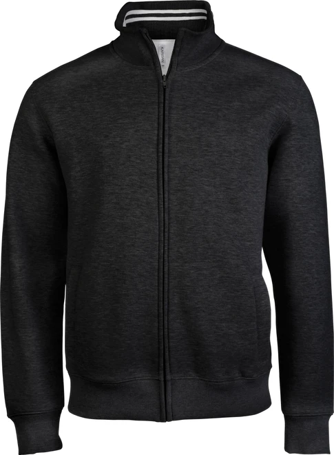 80% combed cotton / 20 % polyester. Low shrinkage brushed fleece. Silicone wash. Fitted style with ribbed side panels. Matching neck tape (except for White body where neck tape is Oxford grey). Contrast striped ribbed inner collar. 2 front pockets. Ribbed cuffs and hem. YKK® zip.