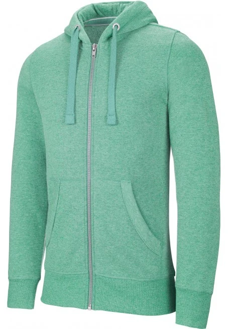 60% polyester / 40% cotton. Melange brushed fleece. Waffle hood lining. Taped neck. Kangaroo pockets. Ribbed cuffs and hem. Size tag only at back neck for easy re-labeling.