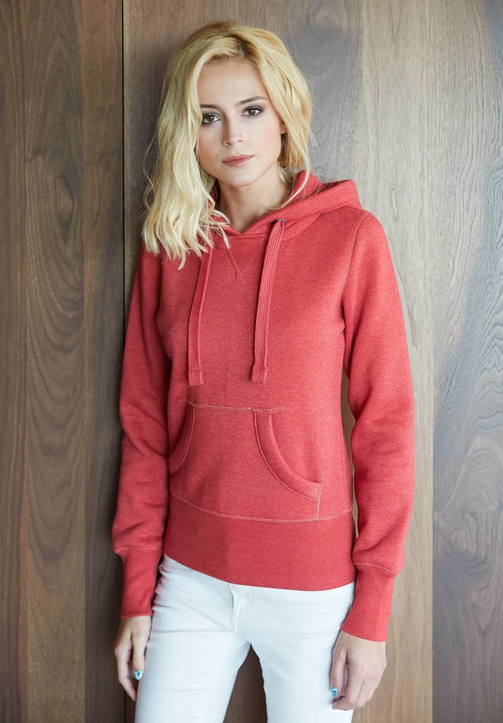60% polyester / 40% cotton. Melange brushed fleece. Waffle hood lining. Taped neck. Kangaroo pocket. Ribbed cuffs and hem. Size tag only at back neck for easy re-labeling.