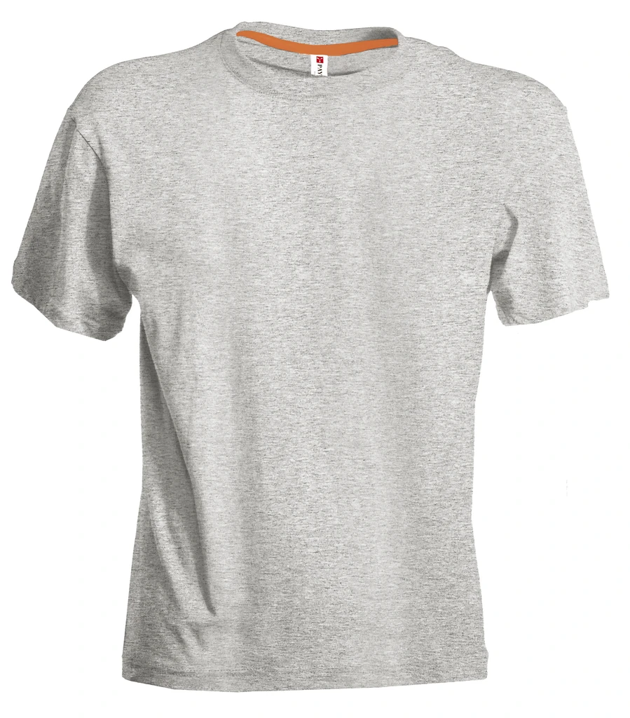 Children’s short-sleeved crew neck t-shirt, with 1.5 cm spandex mix rib neckband with top stitching on the front, contrasting shoulder-to-shoulder reinforcement tape visible on the inside collar, stretch seams, tubular design