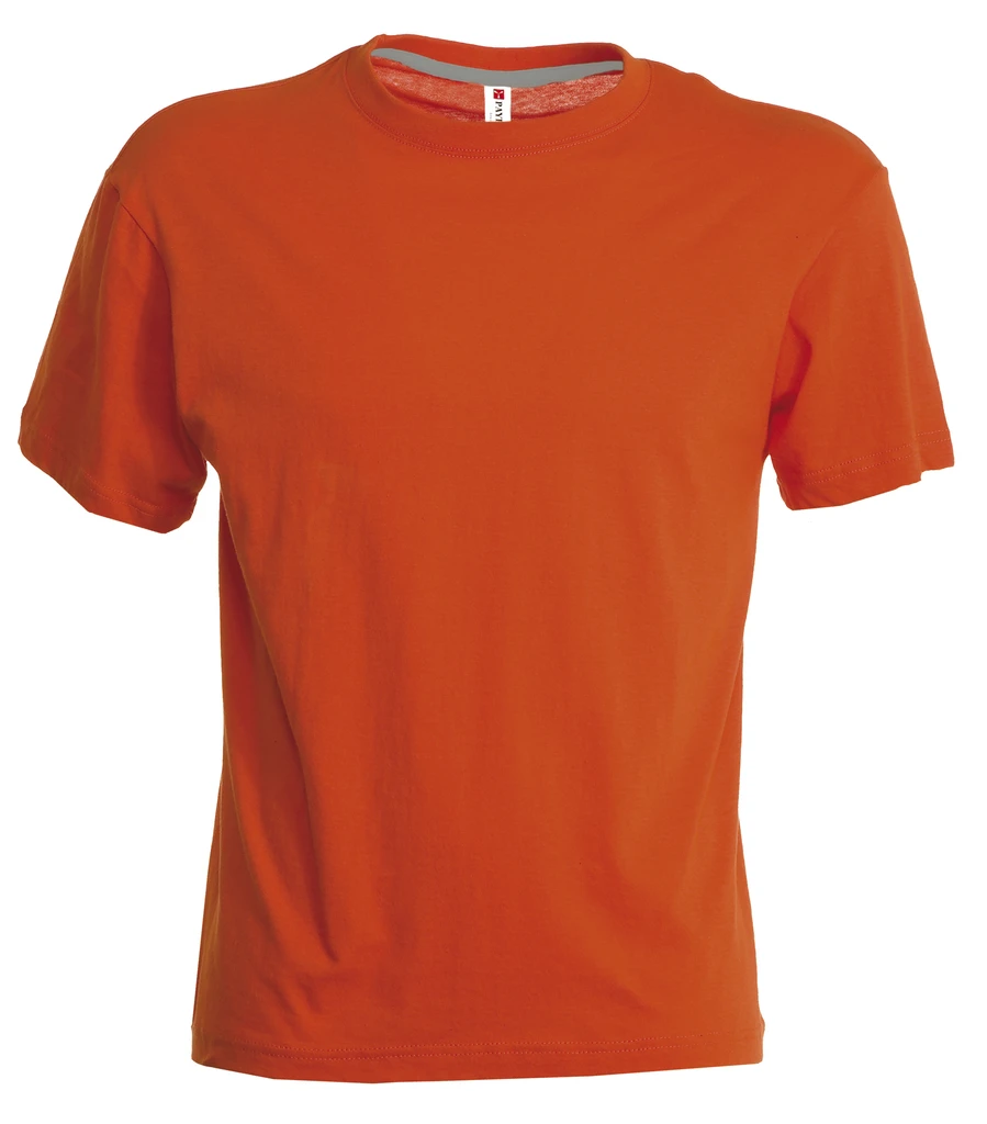 Children’s short-sleeved crew neck t-shirt, with 1.5 cm spandex mix rib neckband with top stitching on the front, contrasting shoulder-to-shoulder reinforcement tape visible on the inside collar, stretch seams, tubular design (camouflage version with side seams)