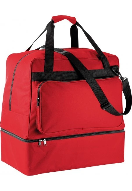 Team sports bag in polyester 600D, double rubber feeling PVC backing, 90 liters. Detachable rigid bottom in PP plastic, with plastic feet. Zipped front pocket ideal for personalization, card holder, detachable shoulder belt with silicon pad. The rigid bottom comes with the bag.