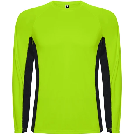 Technical t-shirt combined with two polyester fabrics, short sleeve raglan style. Honeycomb main fabric, and side panels and inner sleeve in microperforated fabric. Crew neck with reinforced covered seams. Comfortable fabric t-shirt and easily fitting to the body.