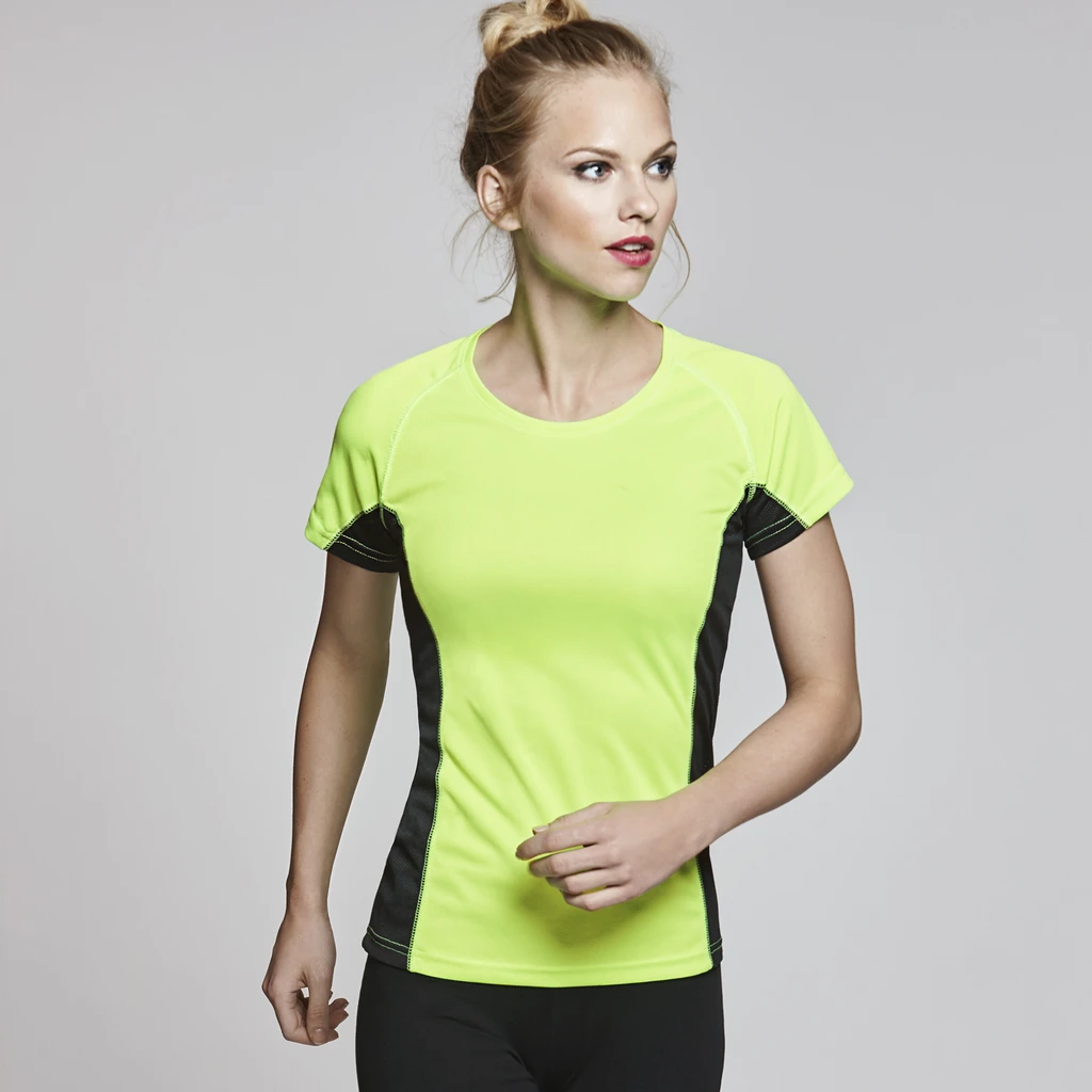 Technical t-shirt combined with two polyester fabrics, short sleeve raglan style. Honeycomb main fabric, and side panels and inner sleeve in microperforated fabric. Crew neck with reinforced covered seams. Comfortable fabric t-shirt and easily fitting to the body.