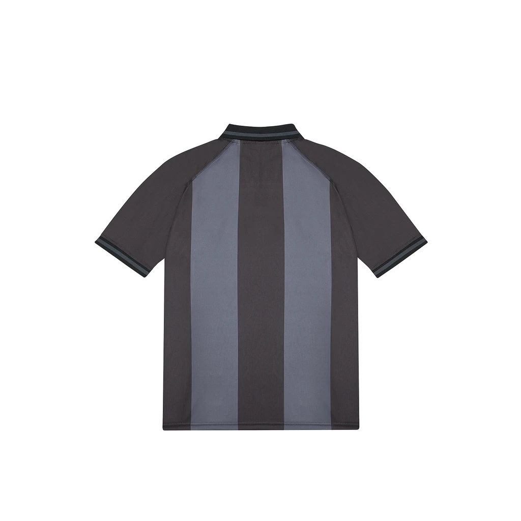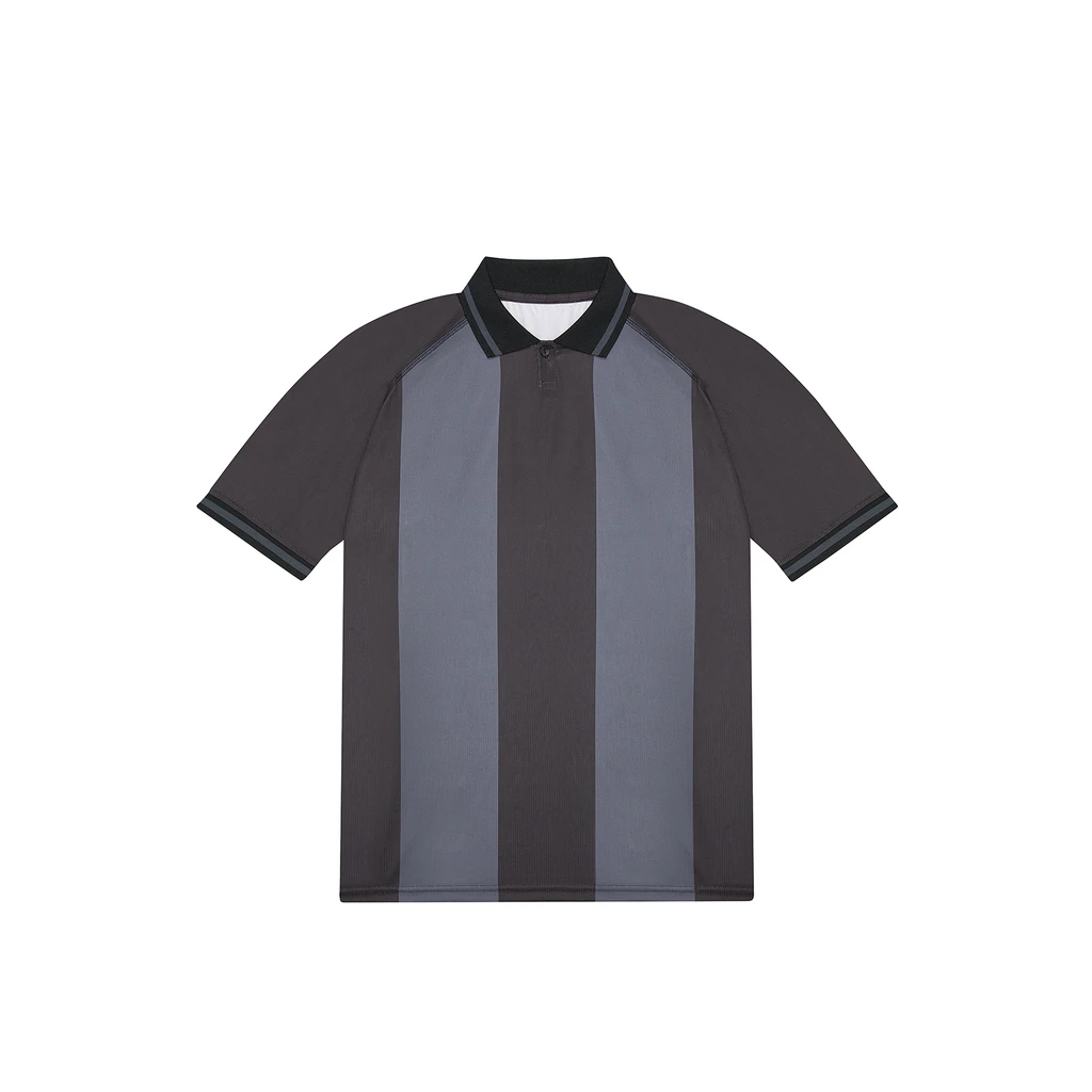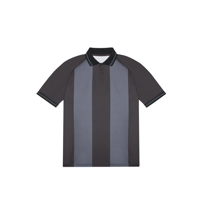 True gender-neutral style with side seams; breathable pinhole mesh fabric with silky handfeel; high quality collar with prominent contrast stripe; short single-button placket; side vents.