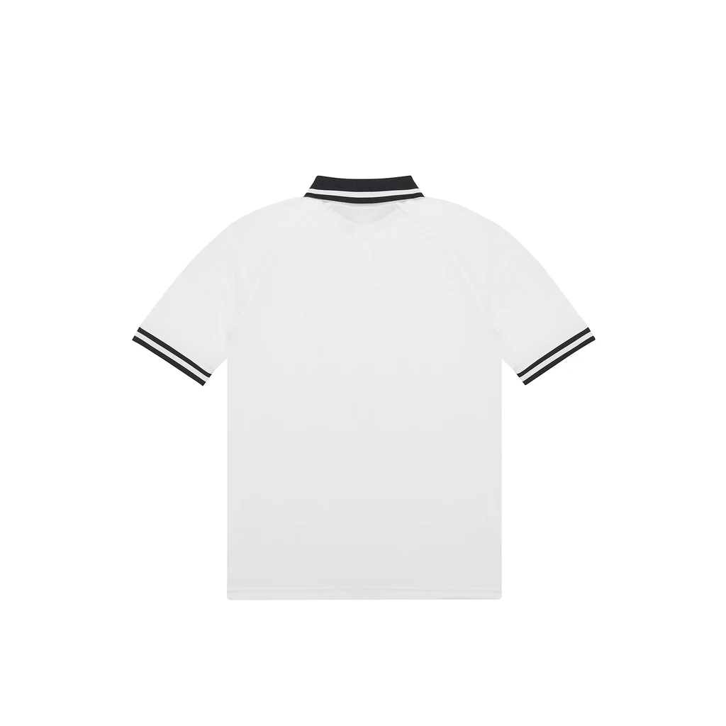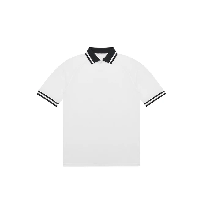 True gender-neutral style with side seams; breathable pinhole mesh fabric with silky handfeel; high quality collar with prominent contrast stripe; short single-button placket; side vents.